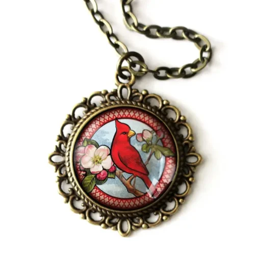Reversed decoupage glass cabochon necklace with elegant antiqued bronze findings. * Nickel-free bronze bezels and chain. * 18″ adjustable chain with extender and lobster claw clasp included. * Pendant is approximately 1″ in diameter. Image are is 20mm. (about the size of a quarter)