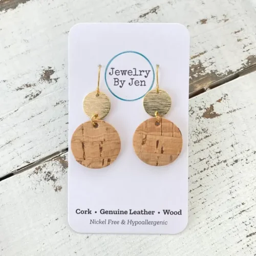 Gold plated Stainless steel silver connector and cork bonded to genuine leather. Stainless steel hook. Measures about 1.50 inches long. Please Note: Natural imperfections are the nature of cork. It is inherent to its surface and adds to the aesthetic. No two areas may be the exact same and will have naturally occurring marks or coloring related to cork.